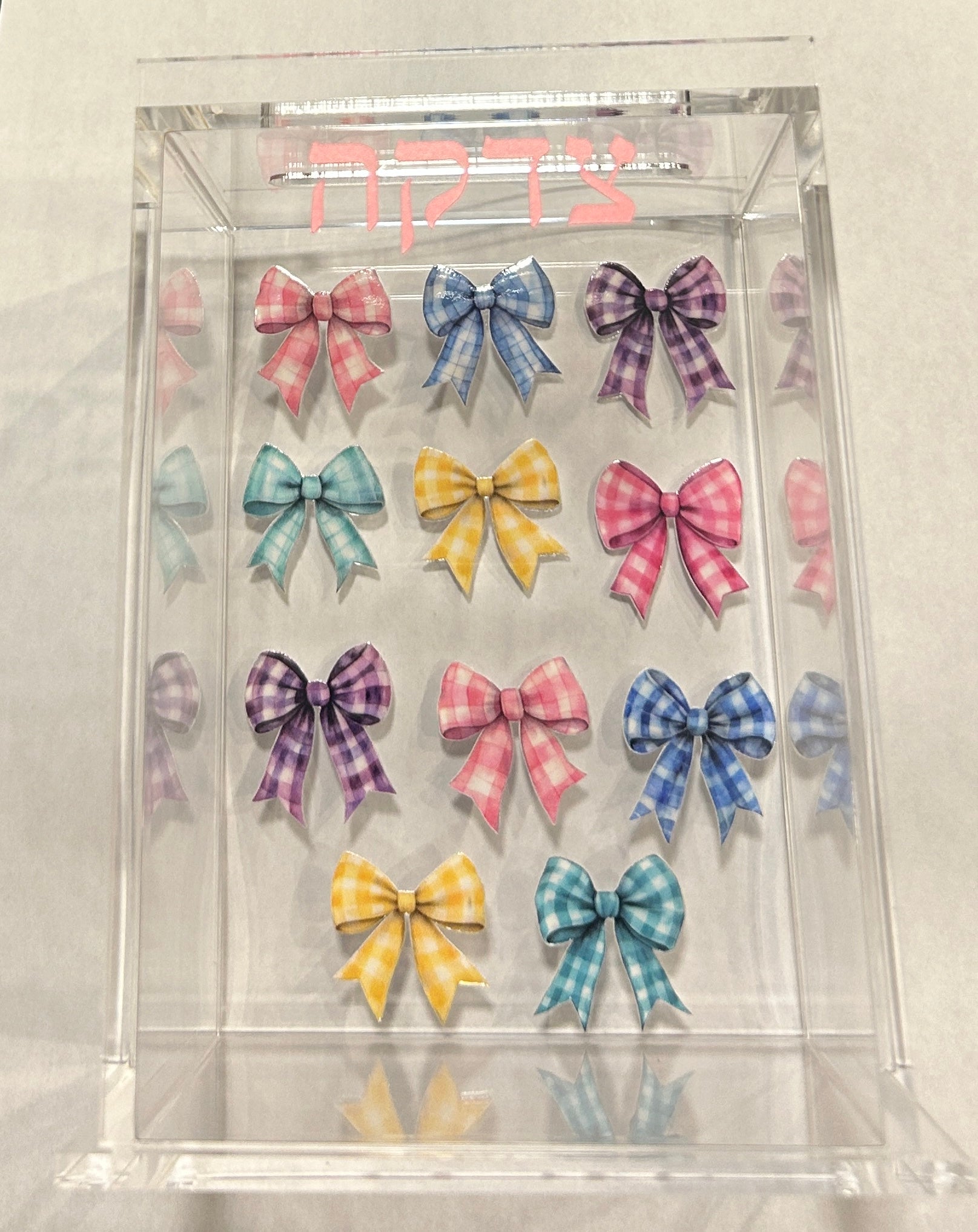 Due to the custom nature of each Tzedakah box the placement of the design and specific style of the design (i.e bow shades, shapes, airplane styles) may differ from pictures shown
